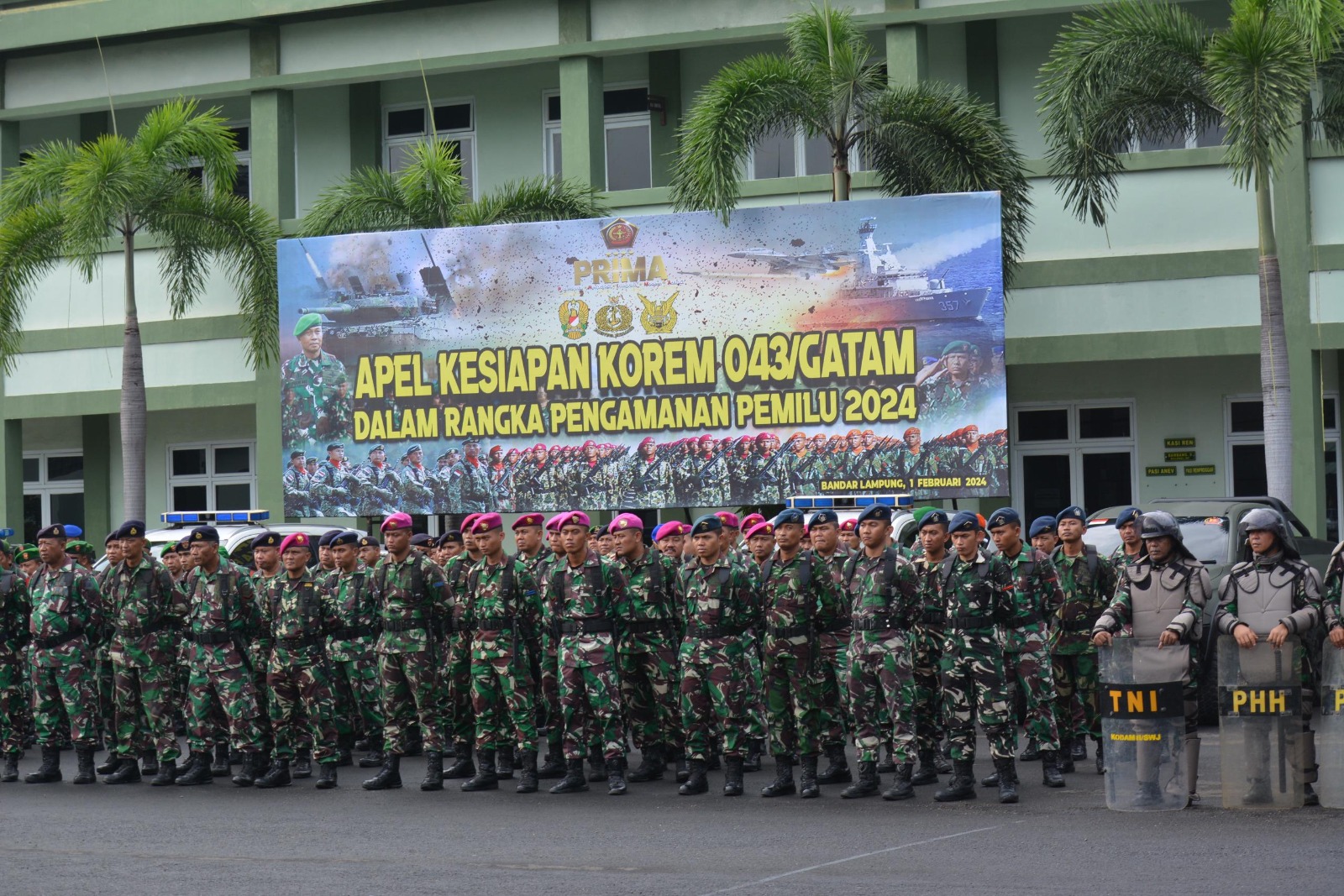 Bertempat di lapangan apel Makorem 043/Gatam Jl. Teuku Umar Penengahan Bandar Lampung, tiga matra TNI Wilayah Provinsi Lampung (TNI-AD, TNI-AL dan TNI-AU) mengikuti apel gelar pasukan pengamanan Pemilu Tahun 2024 yang tersebar di seluruh jajaran TNI secara virtual dengan Panglima TNI Jenderal TNI Agus Subiyanto, S.E., M.Si. Kamis 1 Januari 2024.