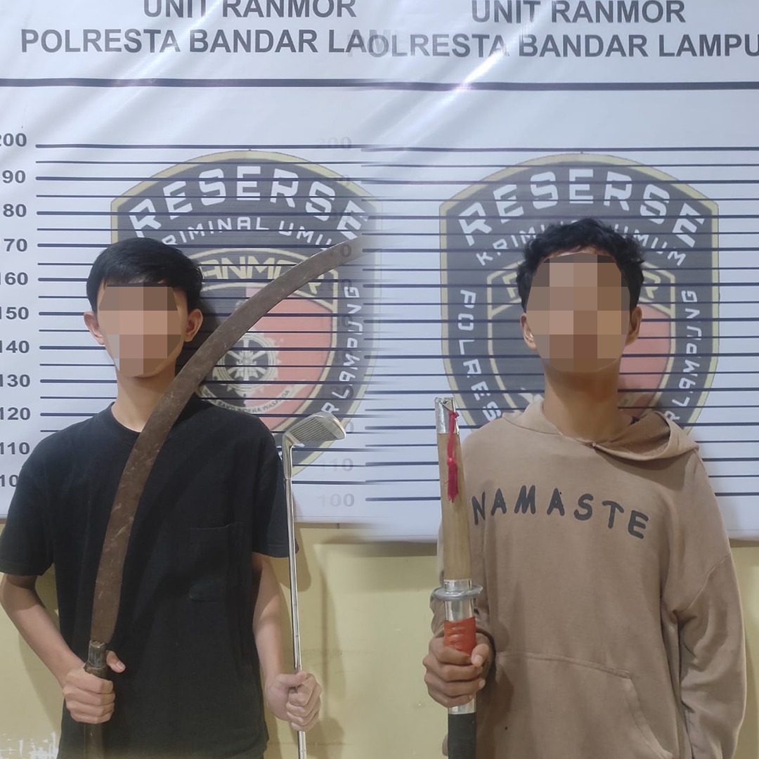 AA (16) dan RA (17), keduanya terjaring patroli hunting yang dilakukan oleh Tim Walet Sampata Polresta Bandar Lampung yang saat itu sedang melakukan patroli di wilayah pahoman Bandar Lampung, di lokasi tersebut, petugas patroli berpapasan dengan 3 sepeda motor dengan masing masing pengendara terlihat membawa senjata tajam.